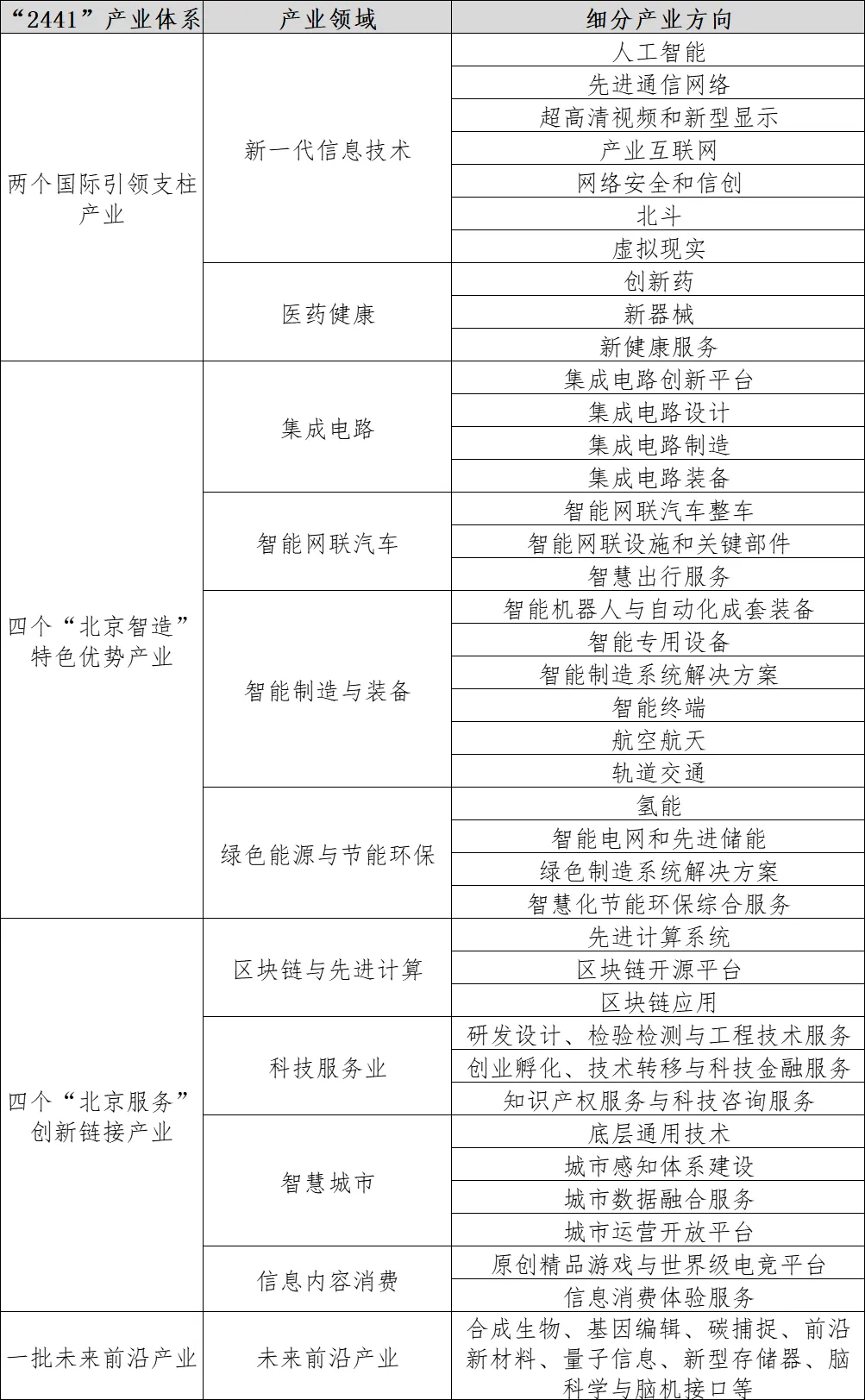 表2 “2441”高精尖產業細分方向